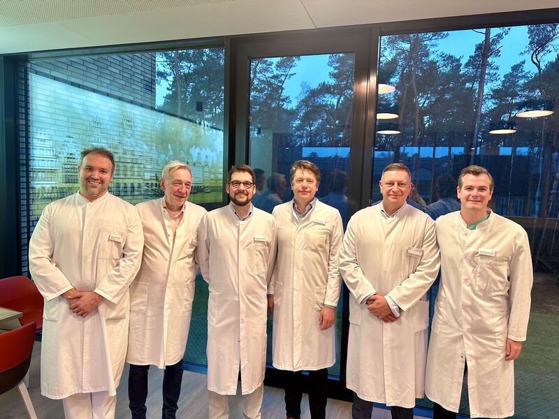Foto: Das ärztliche OP-Team der ersten robotisch-assissierten Penoid-OP v.l.: Dr. Sascha Wellenbrock, Facharzt für Plastische und Ästhetische Chirurgie an der Fachklinik Hornheide und Bereichsleiter für operative Behandlungen bei Transidentität am Center for Transgender Health, Prof. Dr. Michael Sohn, Chefarzt der Klinik für Urologie am Agaplesion Markus Krankenhaus Frankfurt, Dr. Jann-Frederik Cremers, Centrum für Reproduktionsmedizin und Andrologie am Center for Transgender Health, Prof. Dr. Tobias Hirsch, Chefarzt der Abteilung für Plastische, Rekonstruktive und Ästhetische Chirurgie, Handchirurgie der Fachklinik Hornheide und Klinikdirektor für Plastische Chirurgie am Universitätsklinikum Münster, PD Dr. Gerald Pühse, Klinik für Urologie und Kinderurologie am Universitätsklinikum Münster und Prof. Dr. Maximilian Kückelhaus, Geschäftsführender Oberarzt der Abteilung für Plastische, Rekonstruktive und Ästhetische Chirurgie, Handchirurgie an der Fachklinik Hornheide und der Klinik Plastische und Rekonstruktive Chirurgie der Uniklinik Münster.