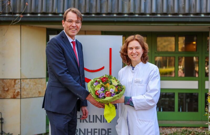 Foto: Krankenhausdirektor Hartmut Hagmann begrüßt Prof. Dr. Carmen Loquai an der Fachklinik Hornheide.